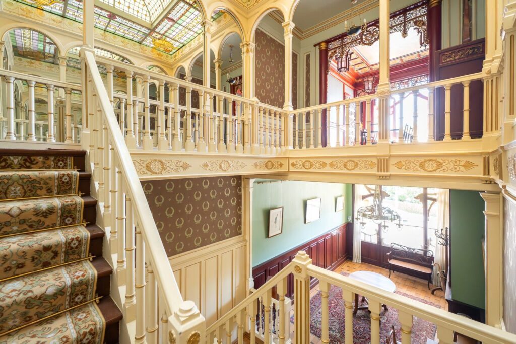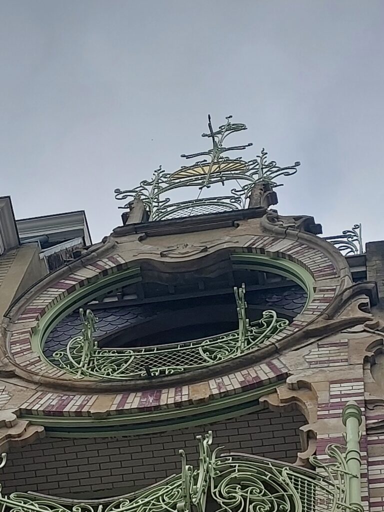 This flamboyant style, dubbed “Art Nouveau-Baroque,” features an abundant and lush use of glass and ironwork adorned with geometric motifs and ornate balustrades at each of the five floors. The wrought iron mimics vegetation, with decorative elements occupying virtually all the available space. While today celebrated, the design was once controversial; as late as 1967, official city bodies criticized it for lacking artistic unity, with the Royal Commission for Monuments and Sites later calling it a “tumultuous work… which reminds one more of a theatre set.”